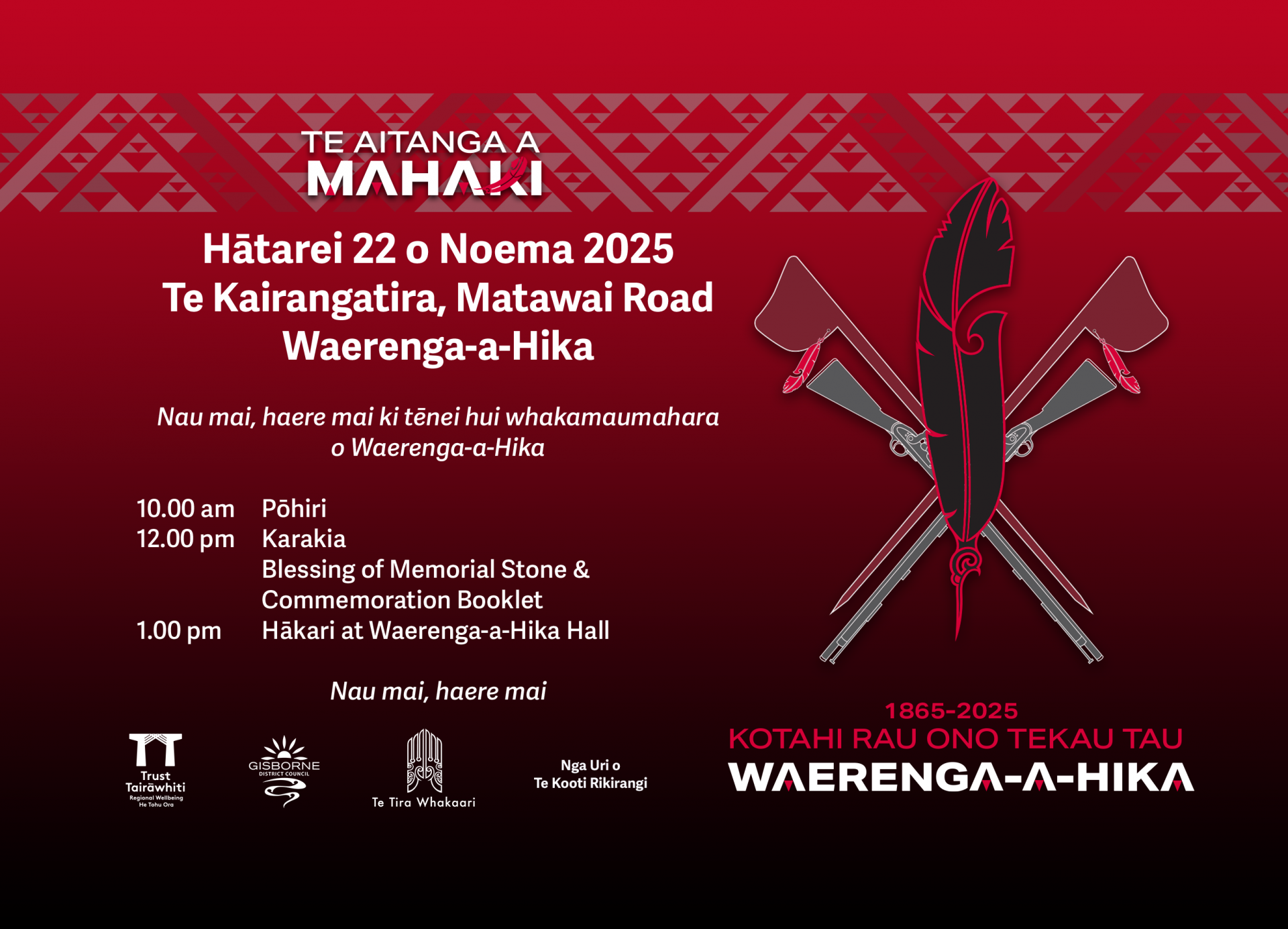 Te Aitanga a Mahaki extends an invitation to our whanau, marae, hapu, and iwi of Turanganui-a-Kiwa to join with us to host the 160 year commemoration of Waerenga-a-Hika.